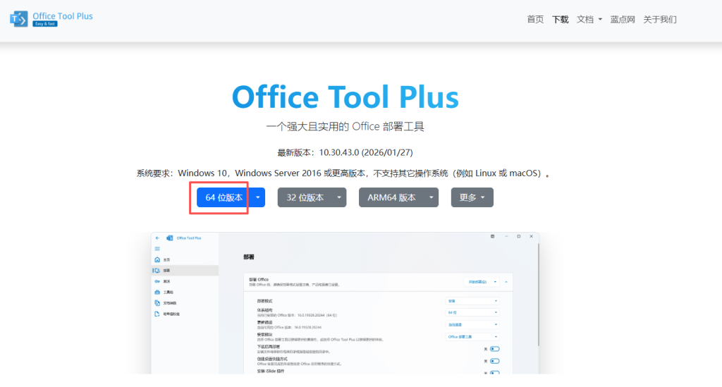 访问Office Tool Plus下载页。点击“64位版本”按钮,浏览器会自动开始下载。
