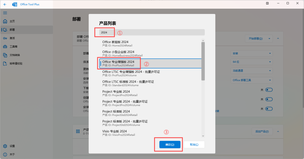 在“添加产品”界面的搜索框中输入“2024”,单击选中后“Office 专业增强版 2024”,再点击下方的“确定”。