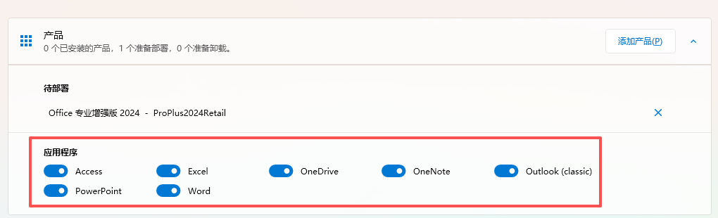 可以在“产品”-“应用程序”中勾选自己需要安装的Office套件,默认是全选安装的。