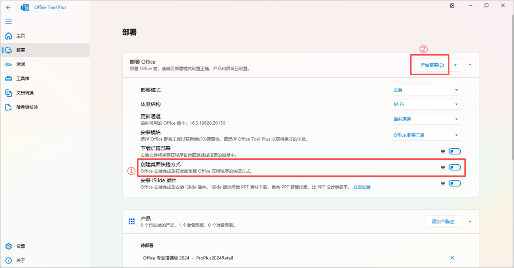 “产品”和“语言”添加完毕后,在页面最上方找到“开始部署”按钮,单击即可开始部署。