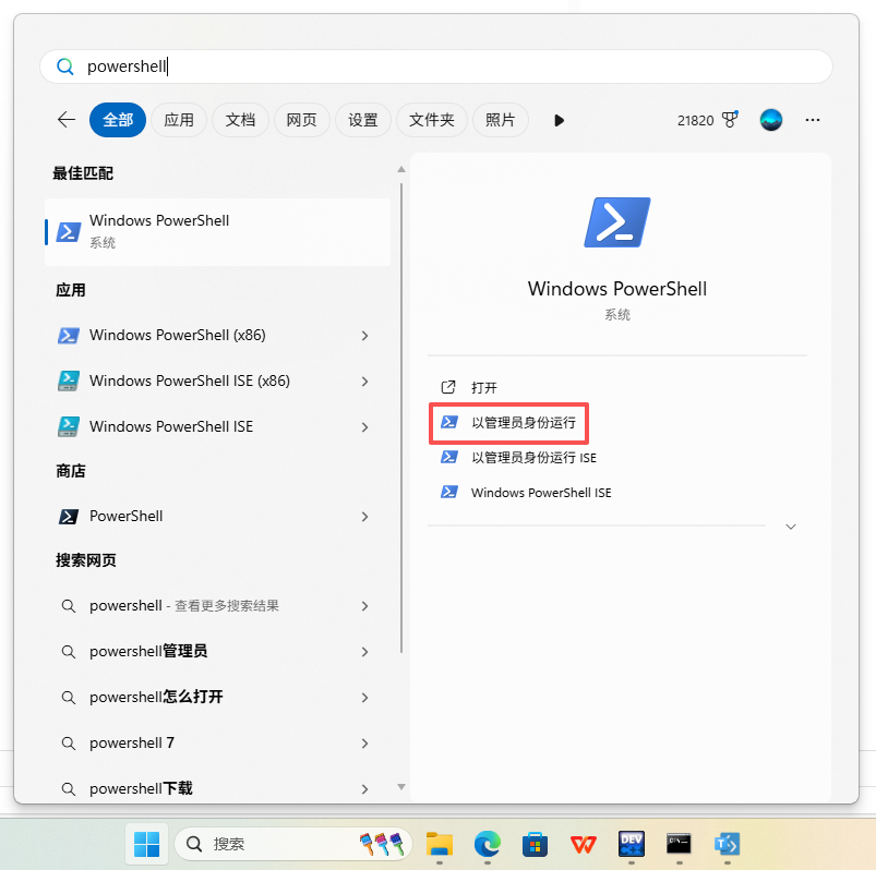 点击开始菜单/搜索框,输入Powershell,并以管理员身份运行。
